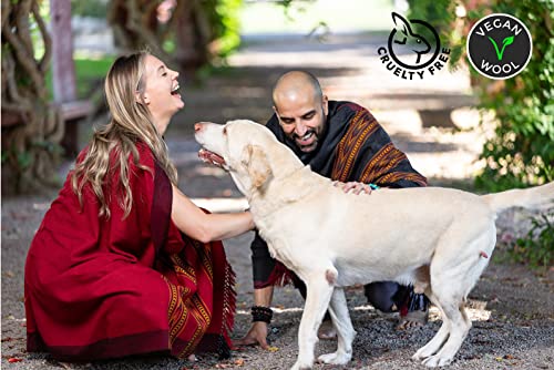 Fabric type: superior Vegan Wool. Proprietary Vegan Acrylic material.Care instructions: Machine WashOrigin: ImportedWEAR ALL SEASONS. Our poncho is cozy and warm, yet lightweight. Perfect layering piece for the cold weather months or chilly summer nights. Wear while camping, hiking, meditating, traveling, practicing yoga or just lounging around the house.DETAILS. The attached hood provides extra warmth, sun/wind protection and adds character to your look. Our ponchos are decorated with a contrasting tribal embroidery and finished with fringe detail. Get compliments every time you wear it.WE CARE. Many animals are harmed in the shearing process. Using a vegan alternative assures that no animal is mistreated in manufacturing our ponchos. Plus, our ponchos are still warm (like wool), do not cause allergies or skin irritation, do not require special care and do not fade or lose their shape.QUALITY CRAFTSMANSHIP. Our vegan wool ponchos are made in northern India, an area known for both its master craftsmanship of textiles/garments and its spiritual pursuance.one-of-a-kind GIFT. A thoughtful gift for any person, man and woman.VEGAN WOOL. High Quality Vegan Wool. Proprietary Vegan Acrylic material. Perfect for everyday use. High quality materials and excellent craftsmanship ensure long-lasting durability.
