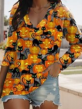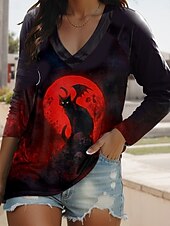More information about Halloween Women's T shirt Black Cat Long Sleeve V Neck Long Sleeve Graphic Casual Vintage Stylish Classic Regular Tops Daily Print Black Yellow Orange Spring Fall Prefall