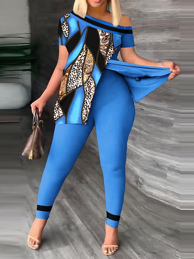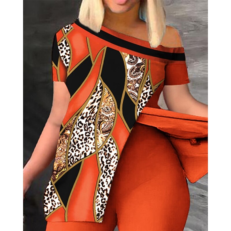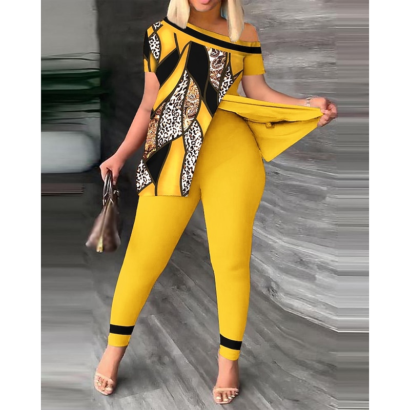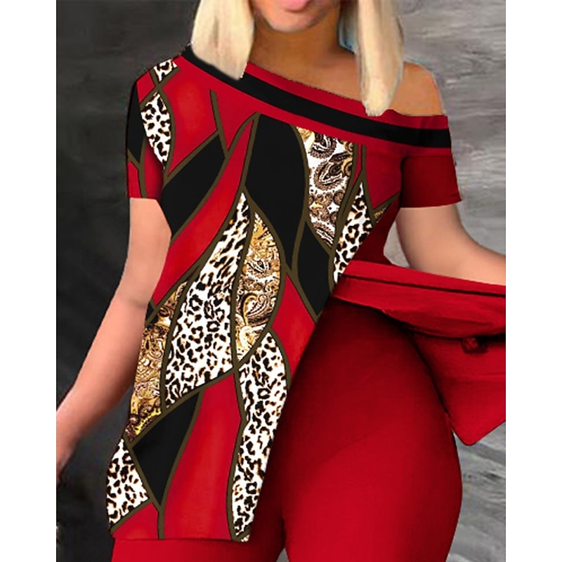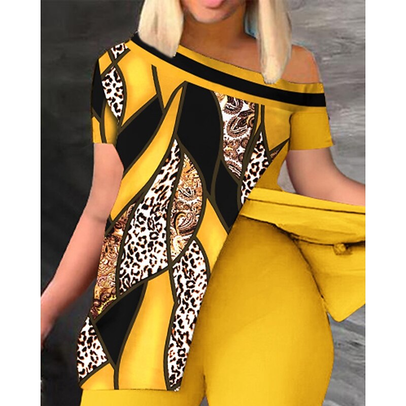 Women's Fashion Shirt Pants Sets Pants Trousers Short Sleeve One Shoulder Leopard Print Casual Daily Yellow Red Blue Spring & Summer Regular Fit
