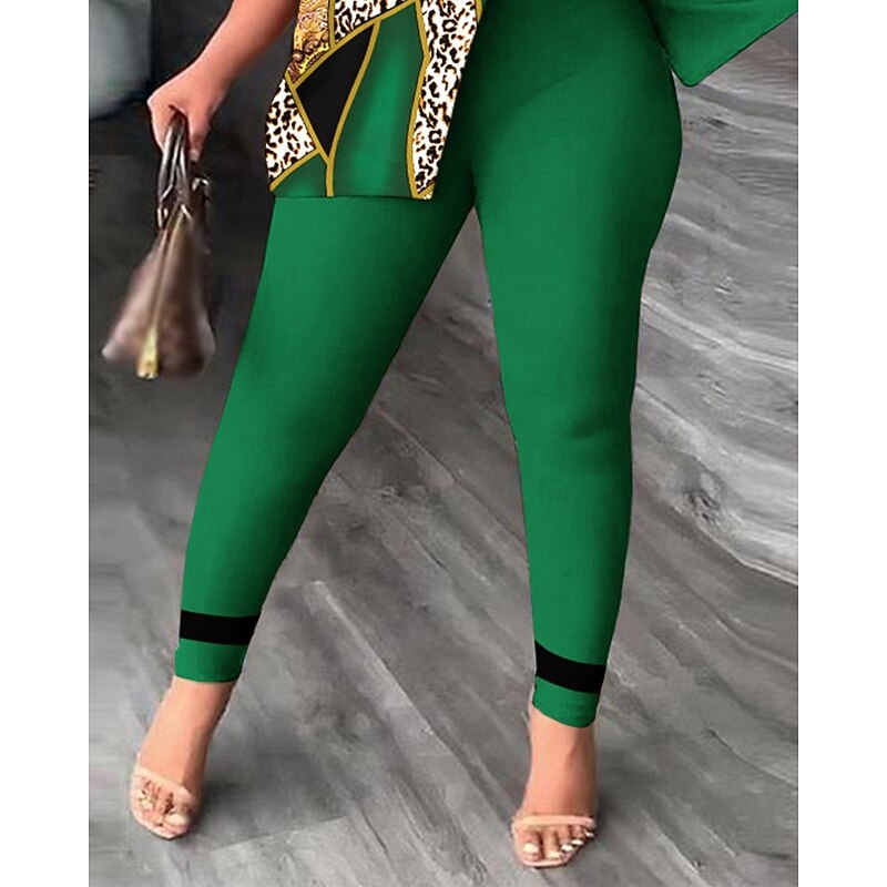 : This ensemble stands out with its distinctive print design, incorporating leopard print elements that add a bold and exotic flair. The top's asymmetrical, one-shoulder neckline enhances its contemporary look, while the pants' slim fit and black ankle cuff accents bring a cohesive touch to the overall design.