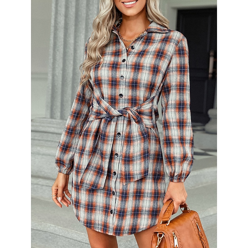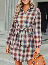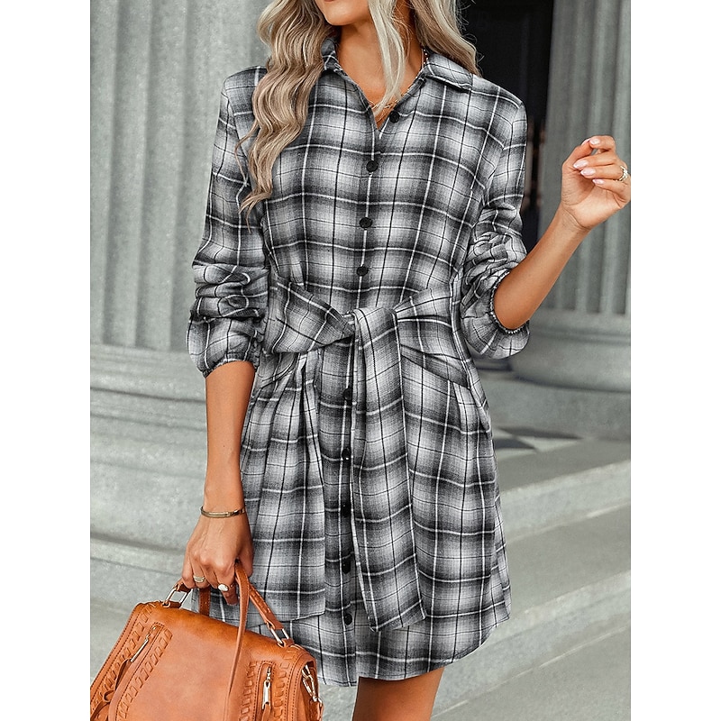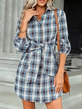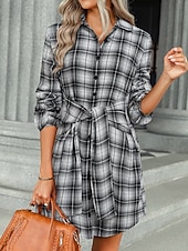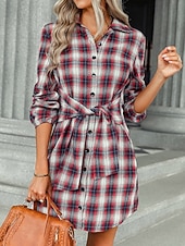 : This dress features a classic plaid pattern in a sophisticated blend of red, black, and white, exuding timeless charm. The button-down front, shirt collar, and three-quarter length sleeves provide a modern twist on a traditional look. The knee-length cut delivers modesty while maintaining chic appeal, and the dress can be dressed up or down with ease.