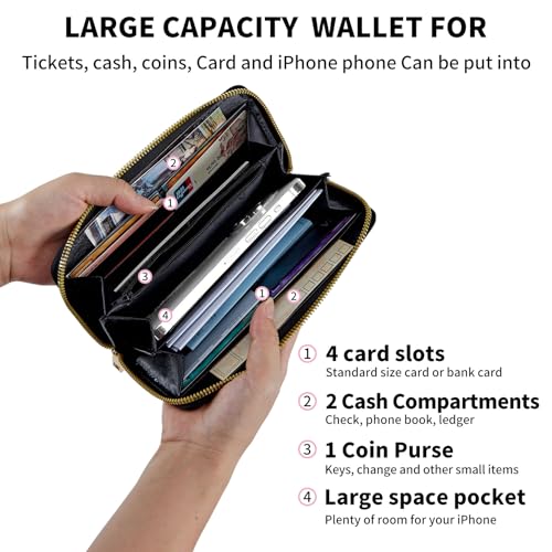 • Wallet with Zipper: Featuring a zipper wrap closure design, it features 17 card slots, 2 currency pockets, 1 ID window slot, 1 inner zipper pocket, and 1 detachable wristband. it looks small but has a large capacity, which can organize phones, cables, ear bugs, bills, credit cards, keys, and other things well