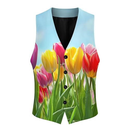 Colorful Tulip-floral Suit Vest for Men Waistcoat Dressy V Neck Button Down Sleeveless Business Jacket Coat 1