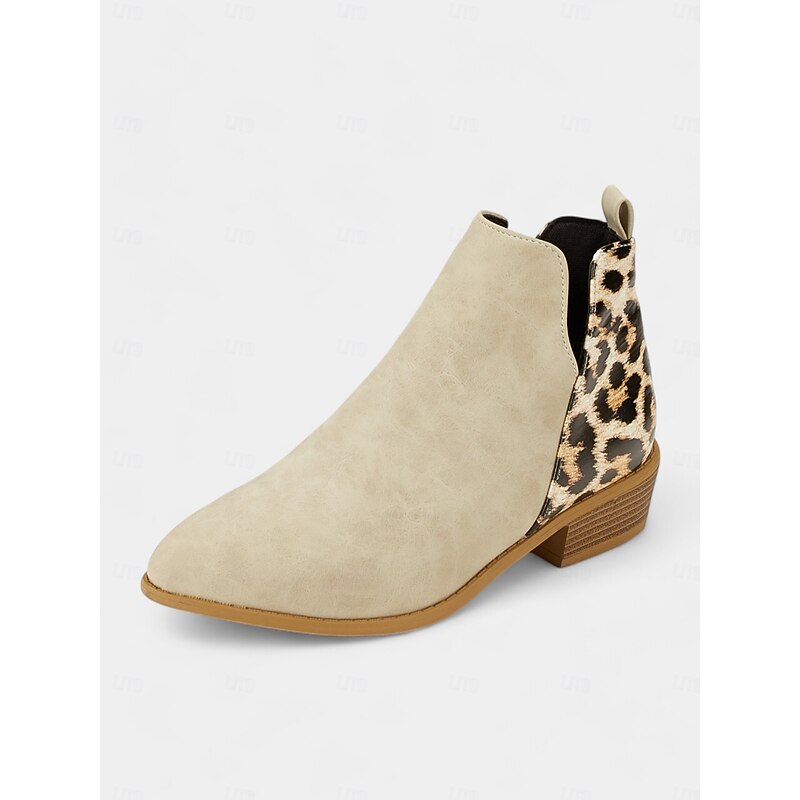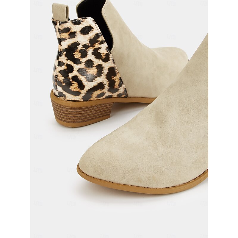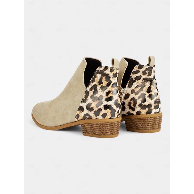 Highlights [Fabric] : Crafted from high-quality PU material, these ankle boots combine a soft, faux suede texture with eye-catching leopard print accents, offering a sophisticated touch to any ensemble. The foam rubber outsole ensures durability and comfort, making them suitable for various seasons. [Shape] : Designed with a round toe and a low block heel, these boots provide both style and support. The block heel is perfect for all-day comfort, while the side zipper allows for easy on and off. [Design Highlights] : The boots feature a chic mix of neutral beige with bold leopard print detailing, bringing a trendy edge to your wardrobe. The sleek side zip not only provides convenience but also adds a fashionable flair to the design. [Occasions] : Ideal for everyday wear, whether you're heading to a casual outing or spicing up your daily outfit. These ankle booties seamlessly transition from jeans to skirts, making them a versatile choice for various occasions throughout the year. [Size] : Available in a range of sizes from US6 / EU36 to US10.5 / EU42. It is recommended to select your usual size for the best fit.