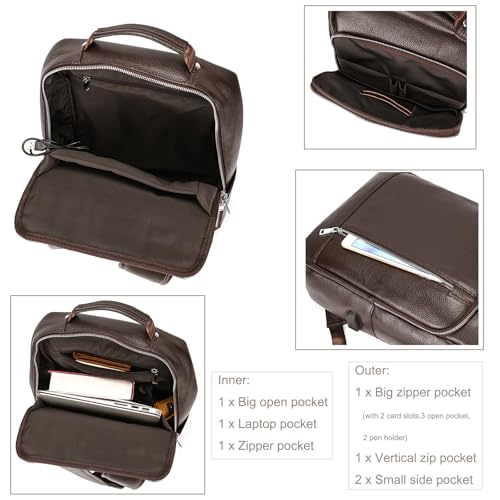 Premium Leather: The backpack is made of genuine leather and superior polyester lining. The surface of the leather shoulder backpack is is textured and smooth, feels good to the touch. It is anti-scratch & water-resistant to withstand light rain, no worry about items inside the bag being wet in a rainy day.Large Capacity: Size 16.1(H) x 11.4 (L) x 5.9 (W). Weight: 1.1kg/2.4lb. Inner structure:1 big open pocket, 1 laptop pocket, 1 zipper pocket; Outer structure: 1 big zipper pocket (with 2 card slots,3 open poacket, 2 pen holder), 1 vertical zip pocket, 2 small side pocket. This Casual leather backpack is big enough to carry on 14 inch laptop and many essentials like ipad, A4 files, notesbooks, umbrella, clothes, wallet, water bottle etc.Practical Design: sleek laptop bag with sturdy luggage belt to hold itself on a rolling suitcase, free your shoulder or hands while carrying heavier stuff. Suitable for work, commute or travel, this leather backpack combines functionality and fashionable design effortlessly.USB Interface: With built in USB charging port outside and built in charging cable inside, allows you to easily to charge your phone, tablet and other devices without having to open your backpack. More convenient and better to save your time.Ergonomic Design: The unisex leather backpack features padded mesh shoulder straps and back panel, which helps relieve shoulder pressure and promote air circulation to provide a breathable and comfortable carrying experience. There is also fixed straps on the shoulder strap for eye glasses. Perfect for everyday use. High quality materials and excellent craftsmanship ensure long-lasting durability.