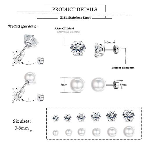 Material: Pearl, Cubic Zirconia, MetalMetal type: Stainless SteelBack Finding: Screw BackEarring design: StudGem type: Pearl, Cubic Zirconia, ZirconHIGH QUALITY MATERIAL: Made of top-grade AAA+ cubic zirconia,faux pearl and surgical stainless steel,which is luxury and vintage, Lots of sparkle,simple and clean design.Makes you more attractive and comfortable to wear. Most economical set for you,shinny sparkle studsSIZE: Gauge Size: 16G =1.2mm,pin size: 7mm,cz and pearl size:3-8mm, The flat screw add extra protection for you.suitable for earlobe perforation size.earrings for women.Meet your different needs. give you more optionsSHINY ROUND CZ/PEARL EARRINGS: 12 pairs of fashion stud earrings come as a set. 6 pairs of zircon earrings, 6 pairs of faux pearl earrings. stud earrings shiny round cubic zirconia and pearl inlaid, elegant and bling choice for your loved one.You can wear multiple earrings at the same time, exquisite earrings can enhance your charmIDEAL GIFT: Our stud earrings set come with velvet bag,perfect to be send as gifts for any females.For mother or your friends etc.On her birthday,prom party,or Mother's Day,Anniversary Day,no matter which day,she must be very happy to get these classic earrings setIDEAL GIFT: Our stud earrings set come with velvet bag,perfect to be send as gifts for any females.For mother or your friends etc.On her birthday,prom party,or Mother's Day,Anniversary Day,no matter which day,she must be very happy to get these classic earrings set