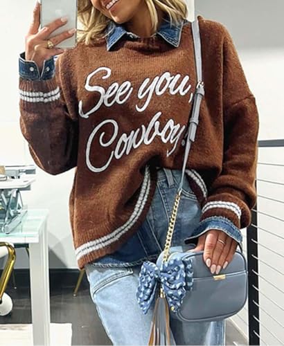 Apvirdy Women's See You Cowboy Embroidered Western Graphic Sweater Loose Crewneck Drop Shoulder Sweater Ribbed Knit Pullover 7