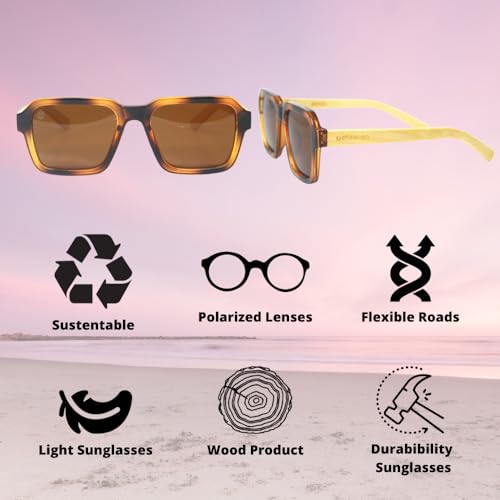 HOT ! Square sunglasses with brown turtle acetate frames and bamboo temples, light and comfortable, with brown polarized lenses, Mondelo Napa Turtle MafiawooD