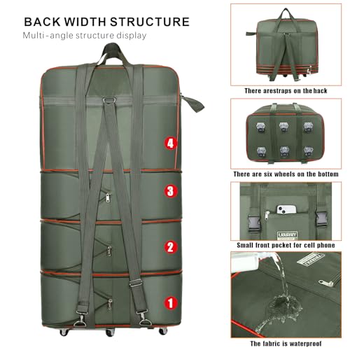 Expandable Large Capacity Travel Bag Oxford Cloth Duffel Bag with Wheels Lightweight Waterproof Travel Foldable Suitcase(ArmyGreen) 6