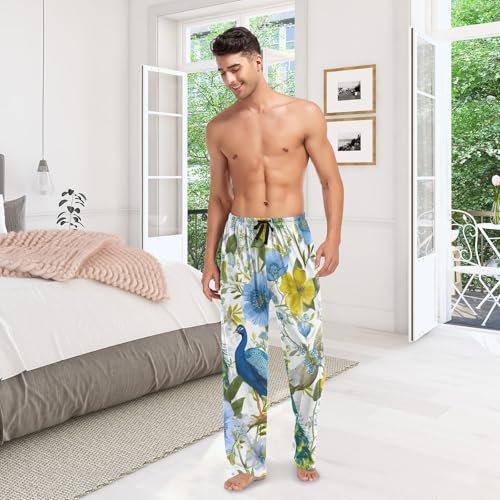 HOT ! Peacock Spring Floral Pajama Pants for Men Comfort Sleep Lounge Bottoms Straight-fit with Pockets S-XXL