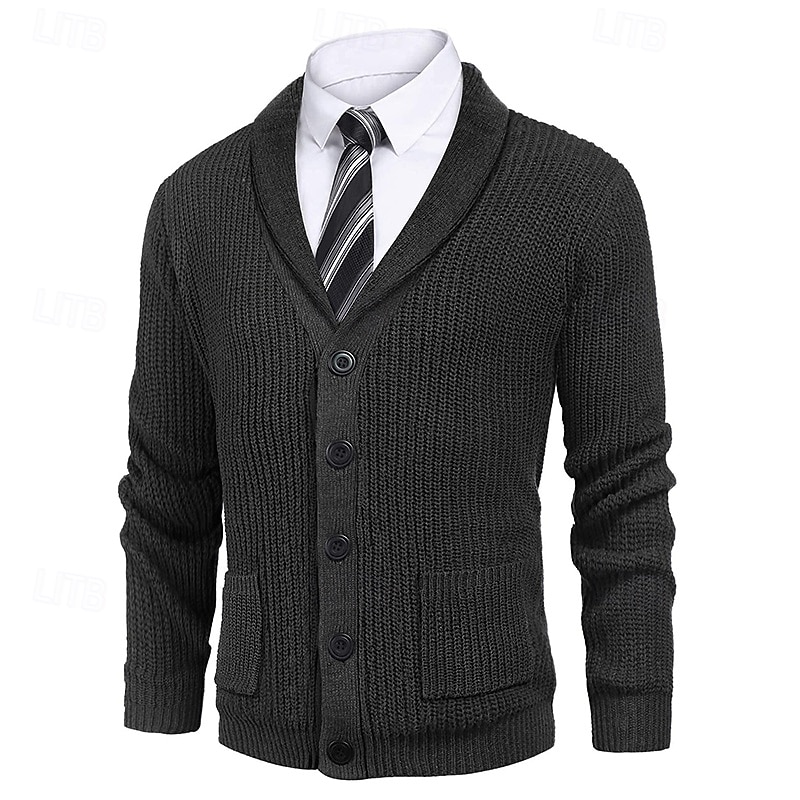 Highlights [Fabric & Material] : Crafted from a premium polyester fabric with a micro-elastic knit, this men's cardigan sweater offers both warmth and comfort. Its ribbed knit design enhances durability and provides a snug fit, ideal for the fall and winter seasons. [Fit & Style] : Featuring a classic and regular fit, this cardigan is versatile enough for daily wear. The timeless shawl collar and button-up closure give it a sophisticated and fashionable touch, perfectly blending traditional and modern styles. [Design Highlights] : This sweater comes with functional side pockets and large black buttons that contrast beautifully against its solid color. The ribbed cuffs and hem add a polished finish, while the lapel neckline elevates the overall aesthetic. [Occasions] : Suitable for a variety of settings, including daily wear, dates, vacations, and weekends. Whether layered over a shirt for a semi-formal look or worn casually, this cardigan complements any wardrobe, providing both style and practicality. [Size Range] : Available in sizes S through 3XL, accommodating a wide range of body types and ensuring a comfortable fit for everyone.