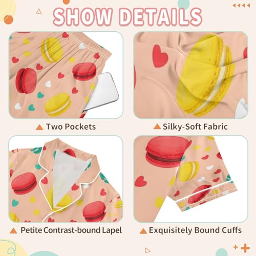 Satin Pajama Sets Short Sleeve Macarons Hearts and Pastels Button Down Silky Nightwear 2 Piece PJS 5-14Y 1