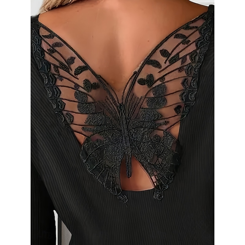 More information about Women's Elegant Lace Tops Eyelet Sexy Blouse Casual Solid Color Regular Tops Long Sleeve Crew Neck Lace Patchwork Regular Fit Daily Black Romantic Petite Tops Summer Holiday Wear Evening Tops