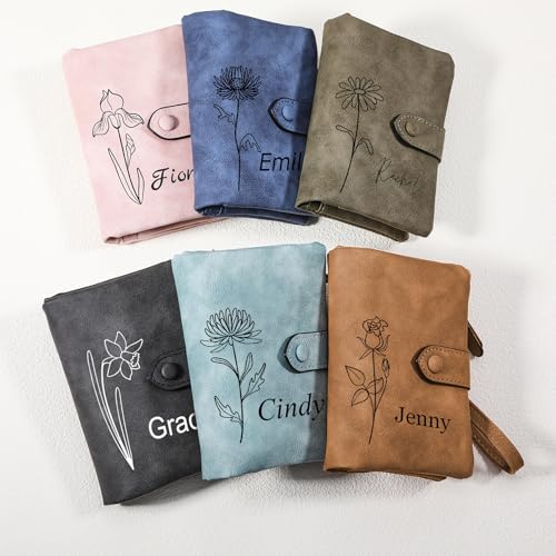 HOT ! INBLUE Custom Leather Purse for Women Engraved Birth Flower with Name Ladies Wallet Small Tri-Fold Zipper Coin Purse with Wrist Strap Personalized Gift for Mom Mother's Day Birthday - Green