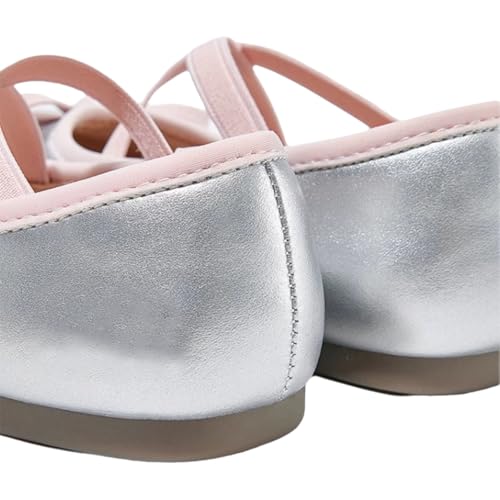 HOT ! Girls' Silver Ballet Flats with Elastic Straps, Metallic Bow Detail, Cross-Strap Design
