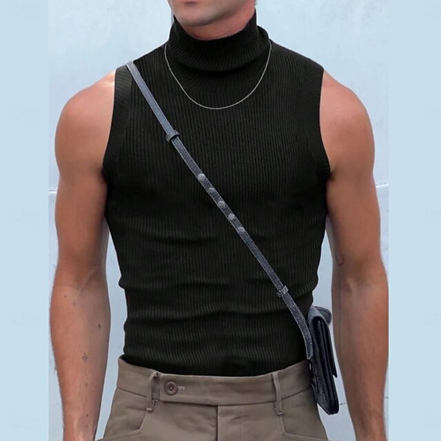 Highlights [Fabric] Crafted from ribbed fabrics, this men's turtleneck top combines comfort and flexibility with a modern, textured appearance. The blend of materials ensures total comfort during wear, perfect for those who seek both style and ease. [Fit] The sleeveless design and fitted silhouette of this turtleneck showcase the wearer's physique, providing a contemporary and flattering look. It's ideal for layering as well as wearing solo, suitable for any occasion. [Design Highlights] Featuring a classic turtleneck and a ribbed texture, this top adds an element of sophistication to any outfit. The solid color pattern paired with pit strip detailing offers a minimalist and elegant aesthetic favored by fashion-forward individuals. [Occasions] Perfect for daily wear and outdoor activities, this versatile top can easily transition from casual outings to more stylish events. Whether you're dressing for a relaxed day out or a more polished occasion, it's a reliable wardrobe staple. [Size Range] Available in sizes S, M, L, and XL, ensuring a range of fits to accommodate various body types, while maintaining a precise fit for each wearer.