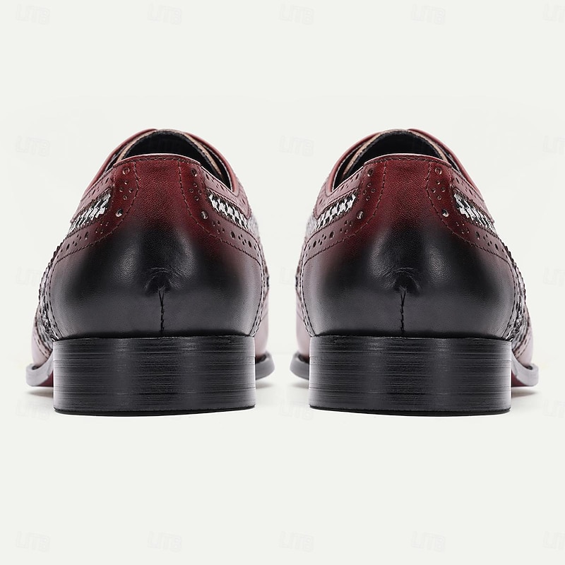 Highlights [Fabric & Material] : Meticulously crafted from high-quality Italian full-grain cowhide, these men's dress shoes boast a rich, wine-red leather exterior that combines durability with an exquisite finish. The polished leather is complemented by a refined plaid pattern, offering both texture and visual interest. [Design & Fit] : With a pointed toe shape and classic lace-up closure, these brogue dress shoes feature traditional detailing that highlights the shoes' sophisticated charm. The lace-up system provides a secure and customizable fit, while the sleek silhouette ensures a modern appeal suitable for any occasion. [Style Highlights] : The distinct brogue embellishments on the toe cap and seams further enhance their classic allure. A fusion of houndstooth accents with rich, brownish-red leather overlays offers a visual contrast that stands out with elegance. [Occasions] : Ideal for formal events, business gatherings, or upscale casual settings, these dress shoes are versatile enough to elevate your look for a wide range of occasions. Whether paired with a business suit or a smart casual ensemble, they add a touch of timeless sophistication. [Size Range] : Available in an extensive size range, from US5 / EU38 / UK4 to US13 / EU46 / UK12, these shoes ensure a comfortable fit for various foot sizes, allowing you to find the perfect match for your needs.