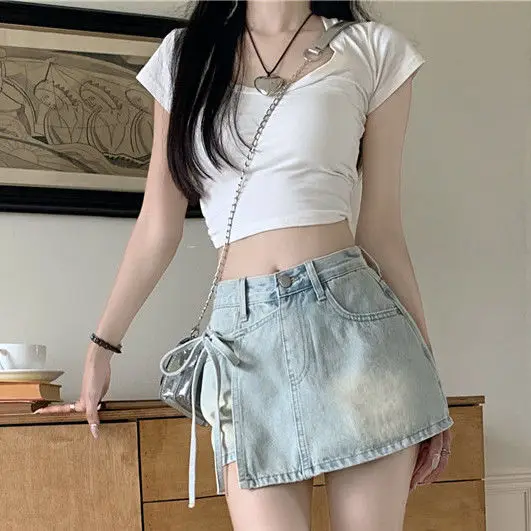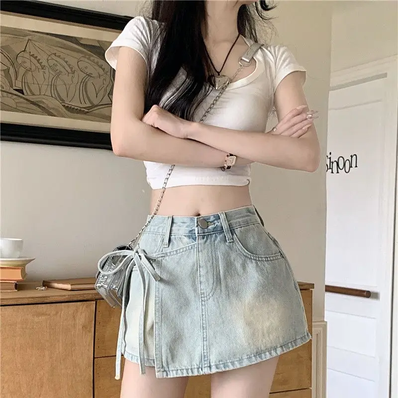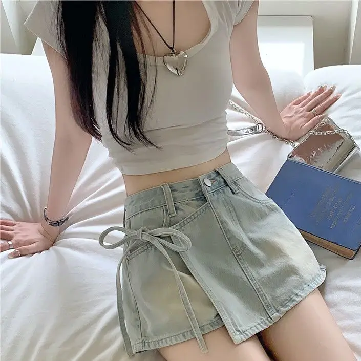Featuring distressed details, pockets, and a trendy tie waist, this skirt adds a touch of personality to any outfit.