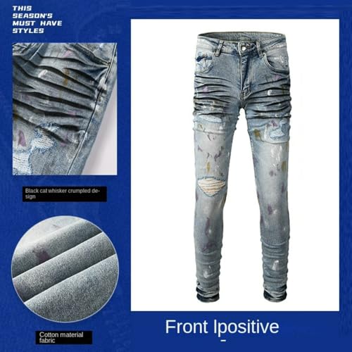 HOT ! Jeans Pants Trouser Denim Street Trendy Worn Holes Spray Painting Graffiti Retro Elastic Tight Tassel Wrinkle Punch Casual Washed Blue Small Leg Men(Light Blue,29)