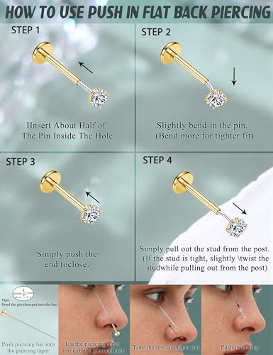 Material: Stainless Steel, Brass, MetalMetal type: Stainless SteelBack Finding: Push BackGem type: Cubic zirconiaItem type name: Body-piercing-studsUltimate Comfort and Secure Fit: Experience unparalleled comfort and security with our flat back stud earrings. Weighing just 1g-2g each, these cartilage earrings ensure all-day and all-night wear without any discomfort. The unique push-in design makes them easy to wear and securely in place, preventing ear pins from poking or tangling in your hair. You can wear these studs body piercing while showering, sleeping, exercising, or working without any hassleMultiple Using: Adorn yourself with the brilliance of AAA+ cubic zirconia flat back stud earrings, offering exceptional sparkle. Our versatile 11 pairs set is perfect for various cartilage ear piercing styles, including cartilage piercing, tragus earrings, helix piercing jewelry, conch piercing jewelry, nose studs, lip rings and multi-hole studs earring options, adding a touch of elegance and sophistication to your lookPremium Materials&SIZE: Our stainless steel threadless flat back earrings lavishly plated in white gold or 14K gold. Hypoallergenic, nickel free, and lead free, these gold cartilage stud earrings set are designed for sensitive skin, ensuring a comfortable, irritation-free wearing experience with smooth edges. Gauge size: available 20G(0.8mm)/16G(1.2mm). Pin Length: 6mm/7mm/8mm. Top size: 3-10mm. Our no-poke threadless earrings are perfectly sized and ideal for any occasionStylish Variety with Our Economy threadless Stud Earrings Set: Indulge in a versatile collection of 11 exquisite designs, including classic CZ cartilage studs, elegant pearl earrings, captivating snake leaf Earrings, and the timeless charm of star moon labret piercing, plus more. Every piece is meticulously crafted for sophistication. This set isn't just for you, share the fashion-forward styles with friends or family and enjoy the exceptional value of this stud earrings setZELORES Multiple Piercing Jewelry Service: If the threadless body piercings jewelry top feels loose, then you just need to remove the pin and slightly bent the pin more than 20 degree when insert the pin. If you have any questions about flat back stud earrings, our team is ready to assist. We aim to provide a flawless shopping experience and resolve any issues promptly Perfect for everyday use. excellent materials and excellent craftsmanship ensure long-lasting durability.