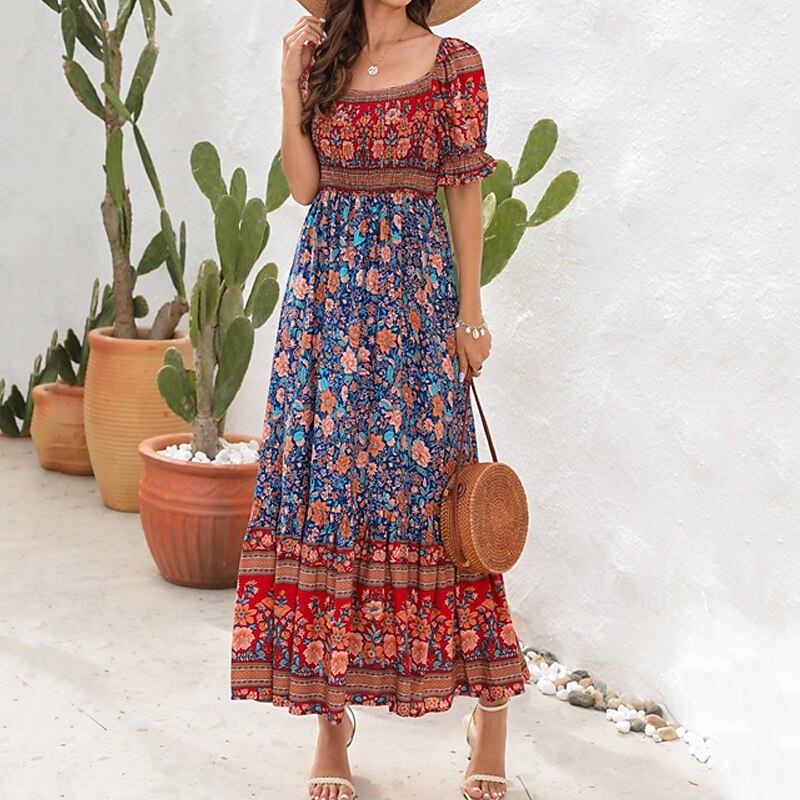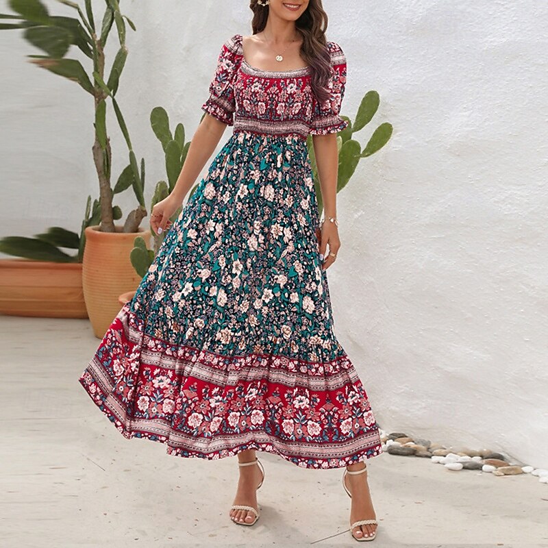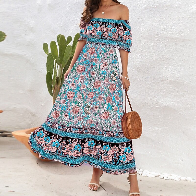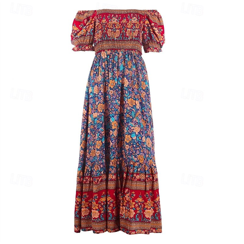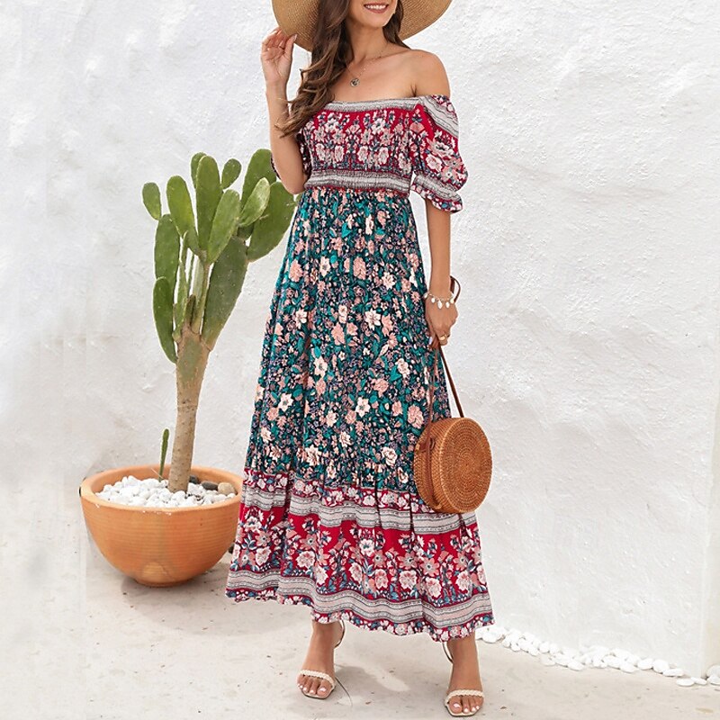 Women's Long Dress Maxi Dress Casual Dress A Line Dress Summer Dress Boho Dress Elegant Stylish Ethnic Vacation Daily Date Regular Fit Floral Short Sleeve Off Shoulder Light Green Red Blue Green 25