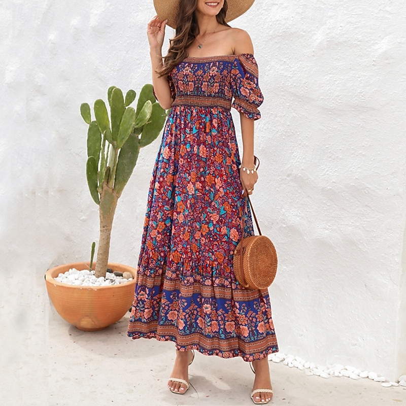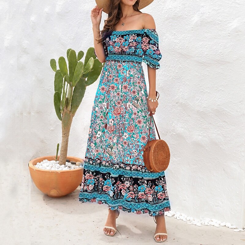 Women's Long Dress Maxi Dress Casual Dress A Line Dress Summer Dress Boho Dress Elegant Stylish Ethnic Vacation Daily Date Regular Fit Floral Short Sleeve Off Shoulder Light Green Red Blue Green 29