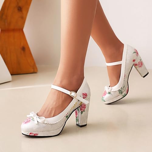 Women's Chunky Block High Heels Pumps Shoes Round Toe Platform Flowers Bow Mary Jane Dressy Shoes 6