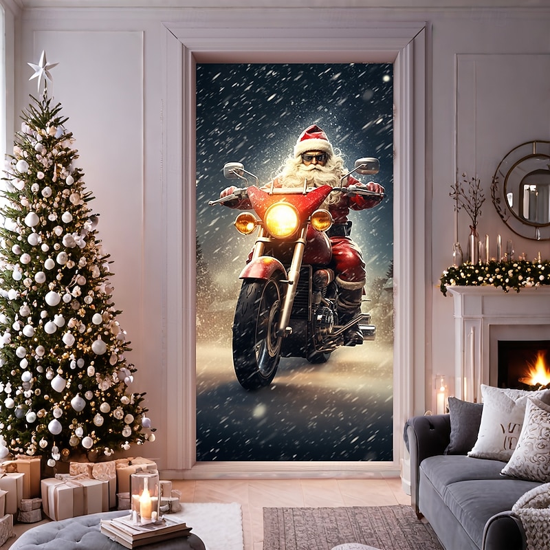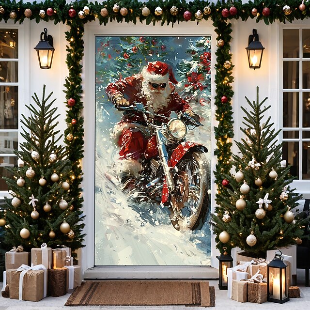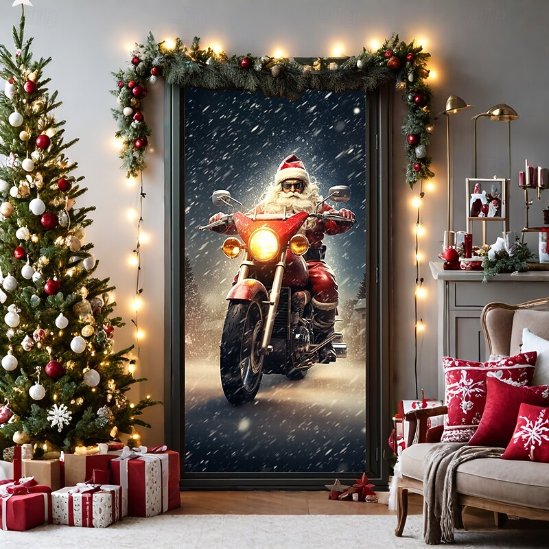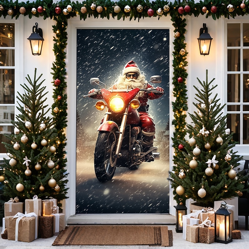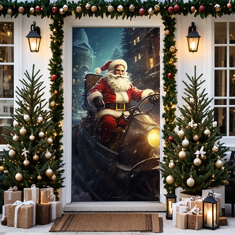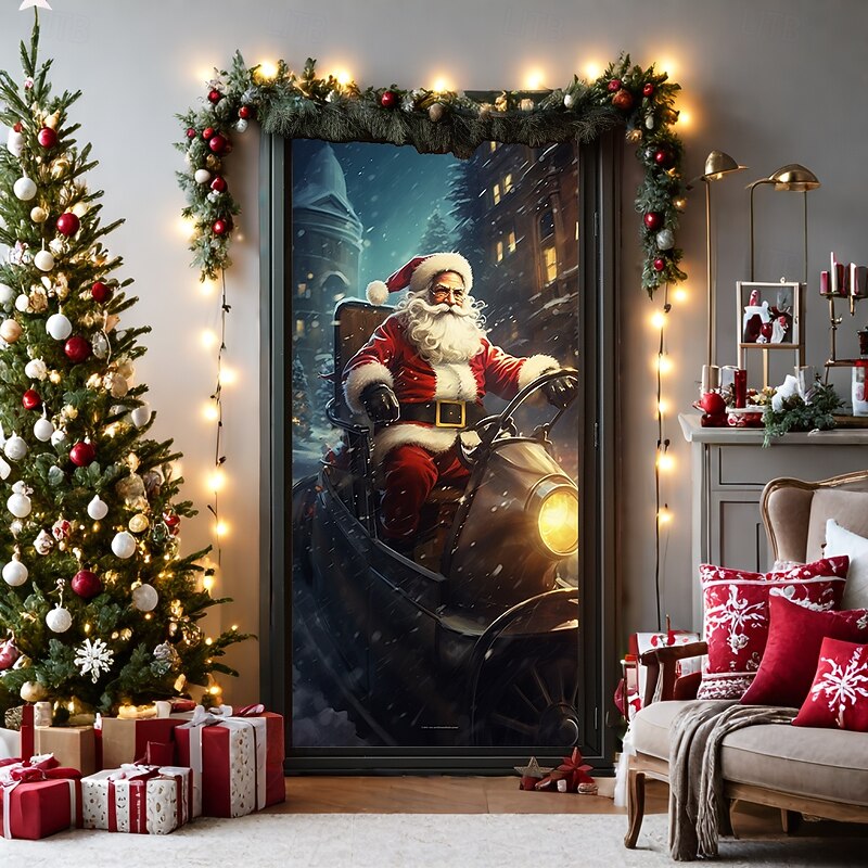 HOT ! Christmas Door Decorations Door Covers Xmas Motor Santa Door Tapestry Door Curtain Decoration Backdrop Door Banner for Front Door Farmhouse Holiday Party Decor Supplies Indoor/Outdoor