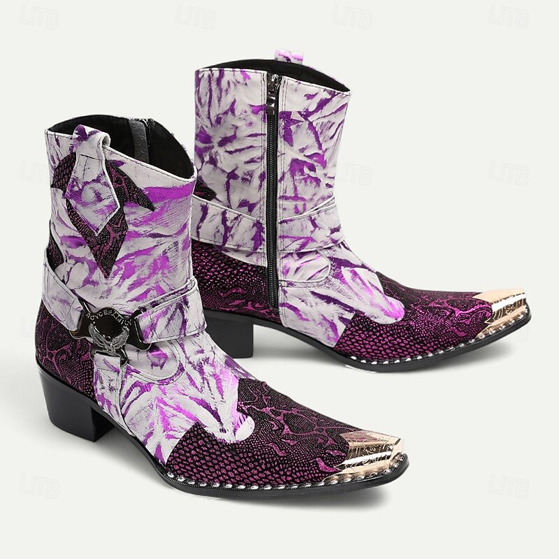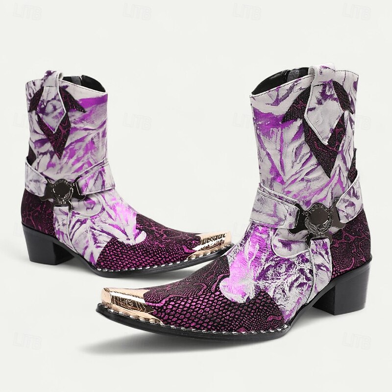 HOT ! Men's Purple Floral Pointed Toe Ankle Boots – Leather Western Style Party Shoes for Nightlife, Stage Performance and Festivals