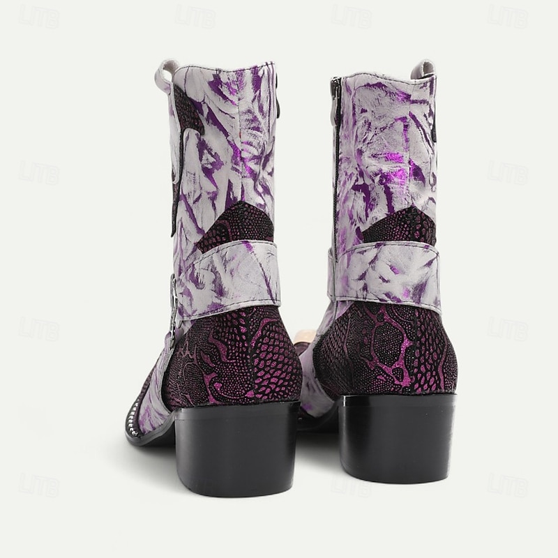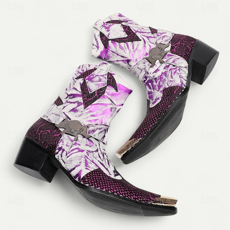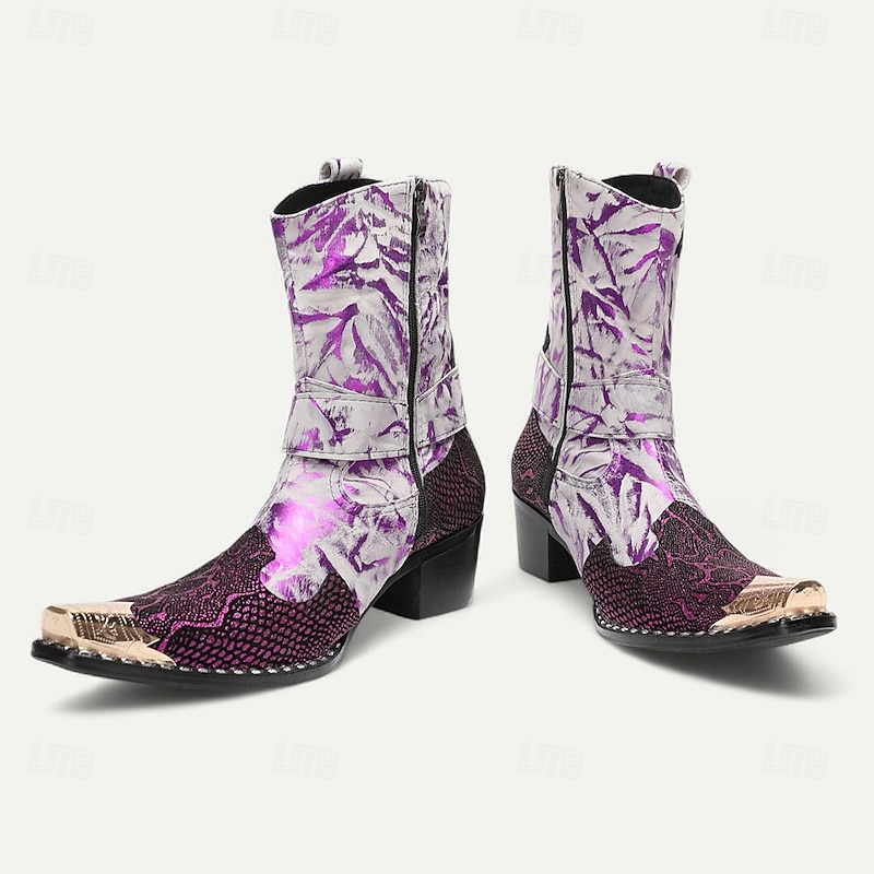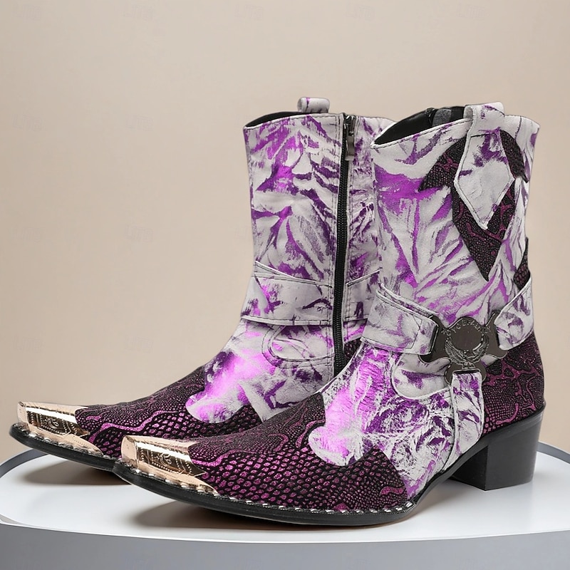 Men's Purple Floral Pointed Toe Ankle Boots – Leather Western Style Party Shoes for Nightlife, Stage Performance and Festivals 2