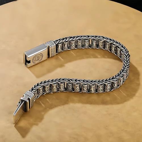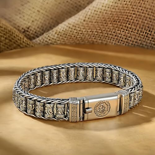HOT ! Sterling Silver Six Words Mantra Bracelet - Buddhist Om Symbol & Greek Key Design, Engraved Braided Chain for Men/Women, Antique Finish Meditation Jewelry Gift with Secure Clasp