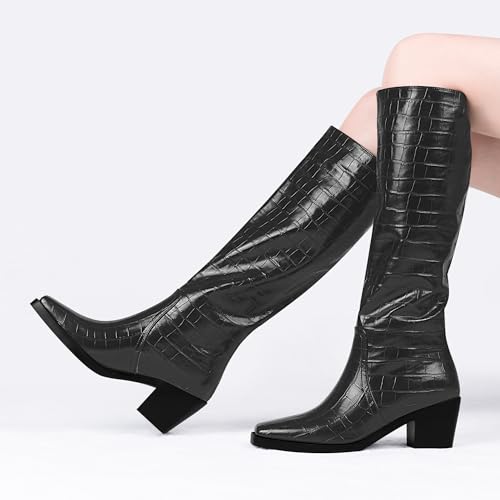 Women's Chunky Heel Square Toe Knee High Boots Slip On Patent Leather Crocodile Boots 6