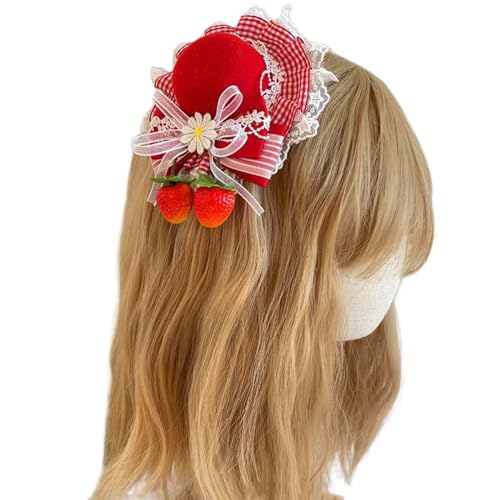 2PCS Delicate Bow Plaids Strawberry Side Clip Top Hat for Sweet Girls Lace Strawberry Bowler Hat 4