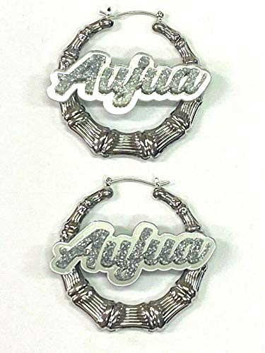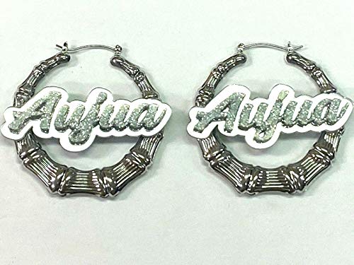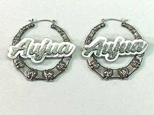 Silver Bamboo Hoop Earrings Personalized Custom Stylish 2.5 Inch Size Name Plate Laser Cut Diamond Look Script Cursive Letters Design Stunning Look - Quality, Attractive Gold Bamboo Earrings, Made To Order - Any Name 1