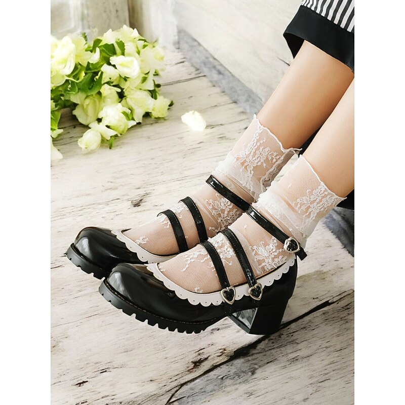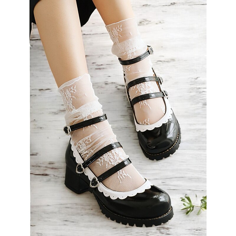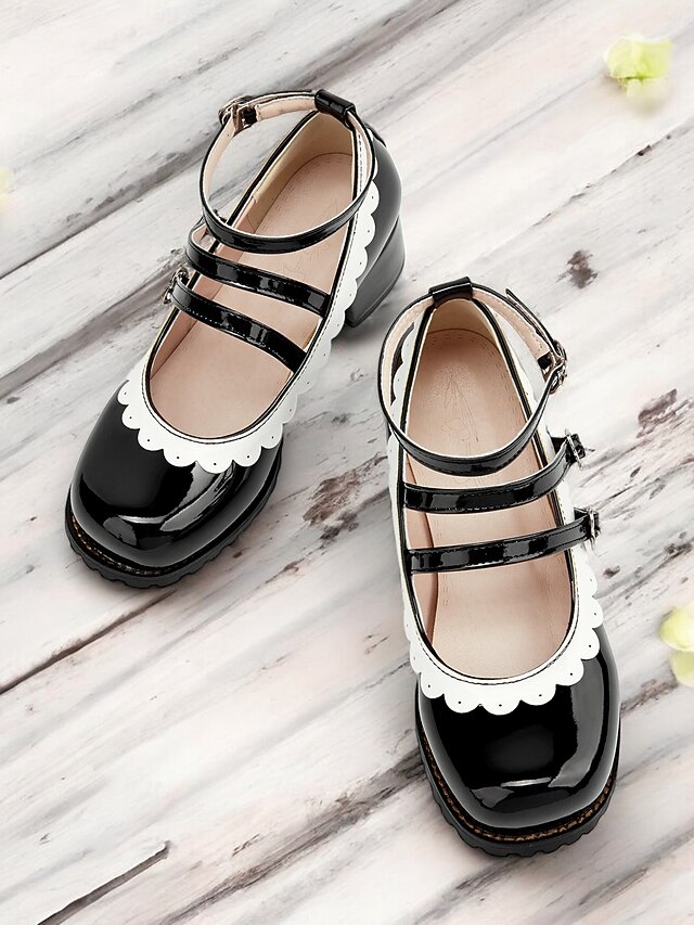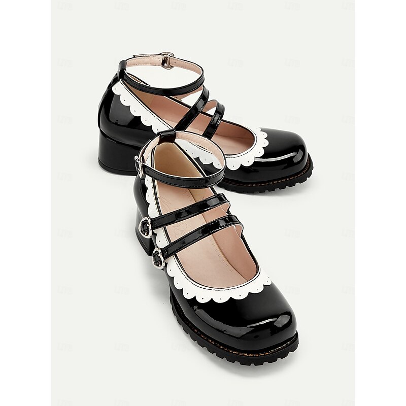 Women's Black and White Scalloped Mary Jane Block Heels – Patent Faux Leather Lolita Platform Shoes with Heart Buckles for Vintage or Cosplay Outfits