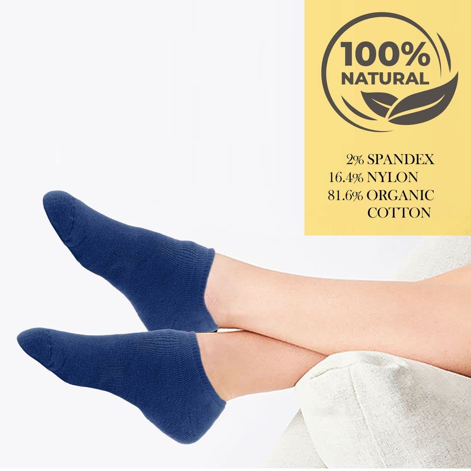 Fabric type: 81.6% ORGANIC COTTON/ 16.4% NYLON/ 2% SPANDEXCare instructions: Machine WashPattern: SolidUNISEX SOCKS - These ankle socks are womens footies socks as well as men s cotton socks. The men s and women's ankle socks are available as socks for teen girls and boys socks too.ORGANIC COTTON VENTILATED SOCKS - The synthetic blend cotton socks are ventilated socks with cushioned soles. These ankle socks provide sweat less, perfect fit and feel good all day long.EASY WASH - These men socks and women socks with high cotton blend are washable inside out and are line dry color socks. They are fast color, remain soft plush and chafe free.LONG WEAR COMFORTABLE SOCKS - The ankle socks are soft plush cushion socks made of premium cotton and synthetic fiber that provide a close fit. These feel good blended cotton socks have a foot padding and thick cushion comfortable heels that make day long wear totally pain less.MULTI PURPOSE COTTON SOCKS - These long lasting ankle footies are slip resistant and a perfect fit with all shoe types. The excellent women and men ankle socks, provide arch support and great for every day wear.