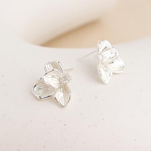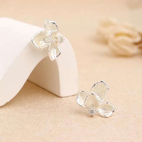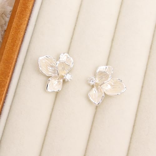 • Elegant white flower stud earrings, with a shiny small zircon embellished at the center of the flower.