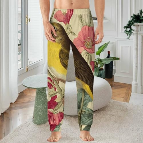 HOT ! Bird Yellow-Bellied Warbler Vintage Flowers Men's Pajama Pants Lounge Pant Sleepwear PJ Bottoms