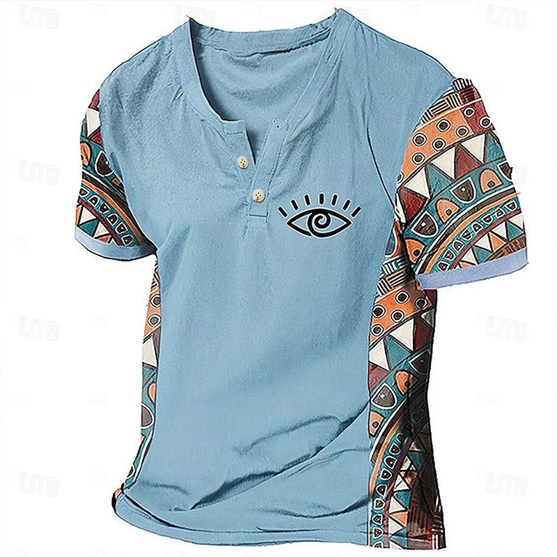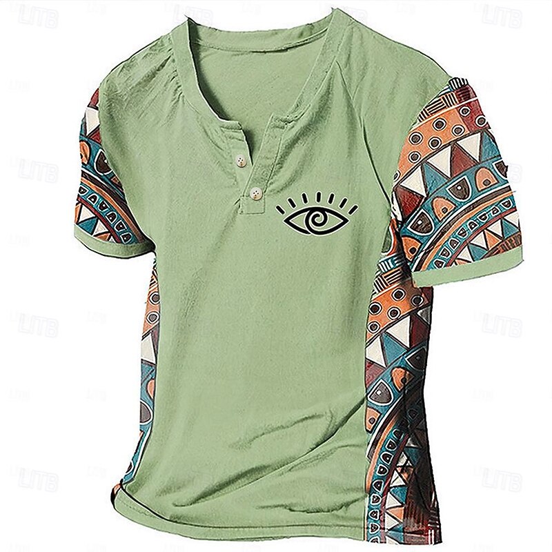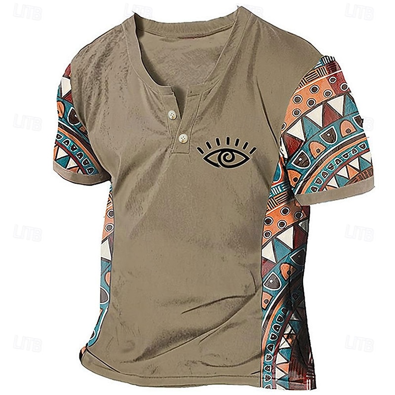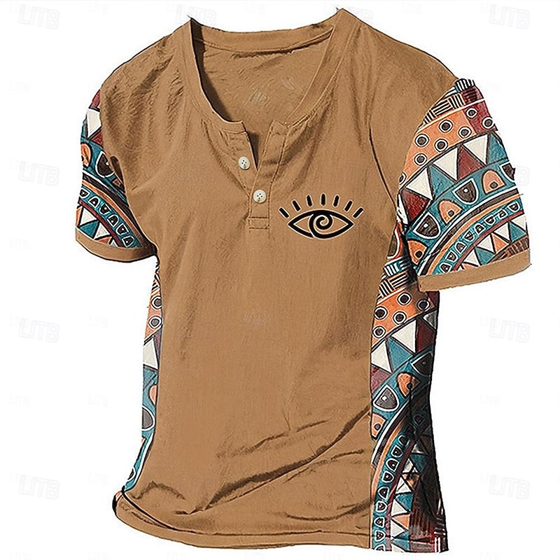 Highlights [Fabric] Crafted from a breathable polyester blend, this men's T-shirt offers both comfort and durability, making it ideal for the warmer seasons of spring and summer. The fabric's micro-elasticity ensures a comfortable and flexible fit. [Fit] Designed with a regular fit, this T-shirt provides a comfortable and relaxed feel, perfect for daily wear and casual outings. The Henley style with a V-neck and two-button placket adds a touch of sophistication to this classic and casual piece. [Design Highlights] The T-shirt stands out with its tribal-inspired graphic and color-block design. The sleeves feature a vibrant geometric pattern in orange, teal, and brown, bringing a bohemian flair. A distinctive eye graphic on the left chest adds an artistic and modern twist to the overall look. [Occasions] Perfect for a variety of settings, this T-shirt is an excellent choice for vacations, outdoor activities, or simply going out for the day. Its versatile style is easy to pair with jeans or shorts for a laid-back and stylish ensemble. [Size] Available in a range of sizes from S to 3XL, this T-shirt caters to a wide audience, ensuring a great fit for different body types.