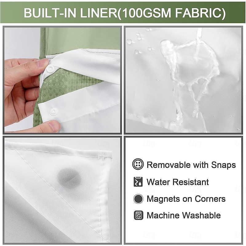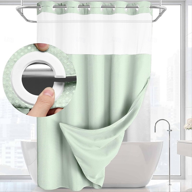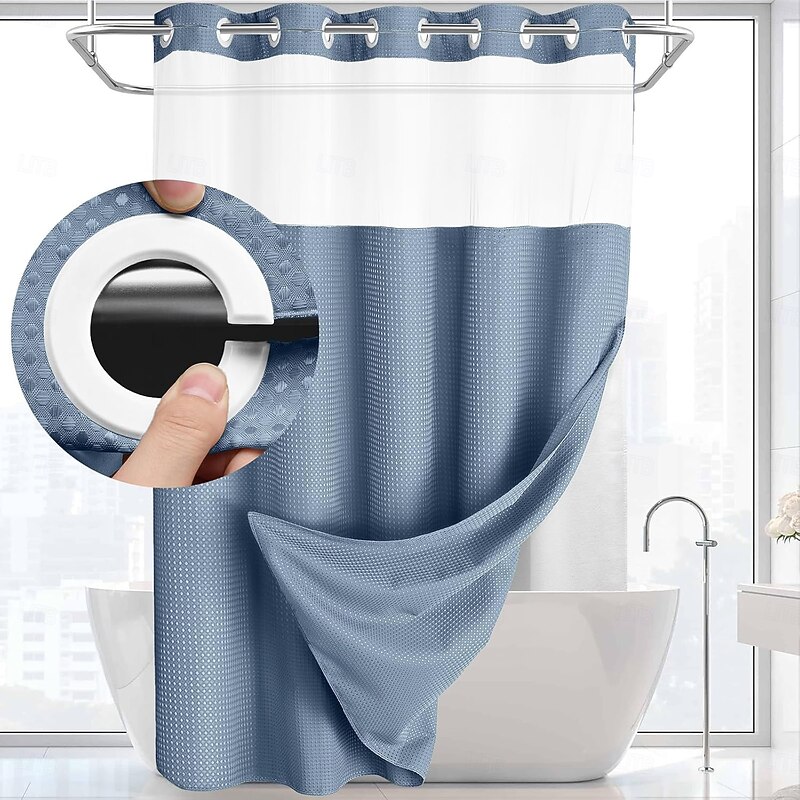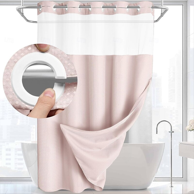 Highlights Hotel-Inspired Elegance – Upgrade your bathroom with this premium waffle weave fabric shower curtain, designed to create a spa-like, hotel-style atmosphere. Soft texture and detailed stitching add a touch of luxury and sophistication to your bath space. Built-In Sheer Mesh Window – Features a see-through upper panel for better light and air circulation, while maintaining privacy. Enjoy a brighter and fresher shower experience every day. Snap-On Removable Liner Included – Comes with a detachable inner fabric liner for easy removal, cleaning, or replacement. Includes 2 weighted magnets at the bottom corners to keep it in place. Hook-Free & Easy Installation – Innovative hook-free design allows you to hang the curtain in seconds without removing the shower rod. Glides smoothly for hassle-free use. Complete Set – Includes 1 shower curtain with a built-in mesh window and 1 snap-on replacement liner. Everything you need for an instant bathroom upgrade.