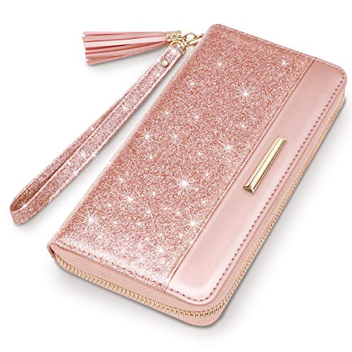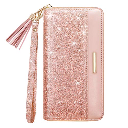 • ★【Original Unique Zipper Wallet】: Smooth zip around women’s wallet features 12 card slots, 3 cash holder (also checkbook holder ) and 1 zippered pocket for coins. You can carry all your cards, passport, IDs, receipts, cell phone, tickets and other small items securely., High quality metal accessories.This rose gold long purse with tassel and wrist strap specially designed for women.