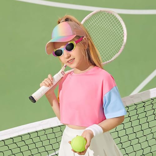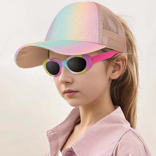 Girls Baseball Hat Kids Sunglasses, Rainbow Criss Cross Cap Adjustable Summer Cap Trucker Hat with Polarized Sunglasses for Girls Sports Travel Hiking Spring Summer 7