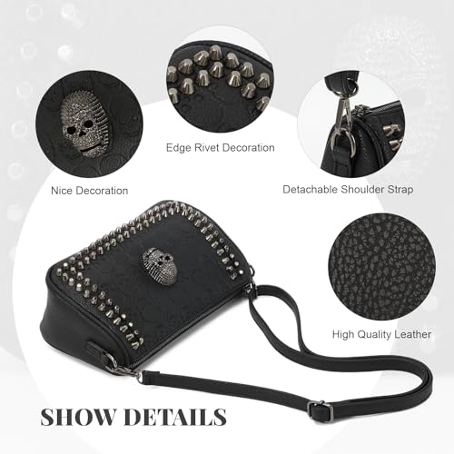 • Design -- 3D Skull Decoration,Star shaped rivets and Gunmetal-gray studs;Smooth silver toned zipper closure for better security,Well made fashion designer bags; It can be used as women's handbag, travel bag, goth messenger bag, satchel bag, crossbody bag, shoulder bag, handbags for women, sling bag for women .