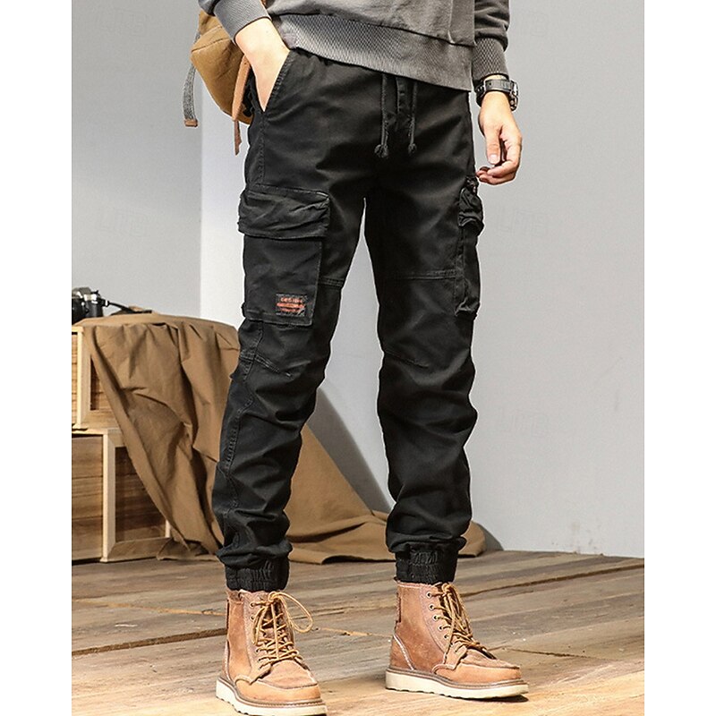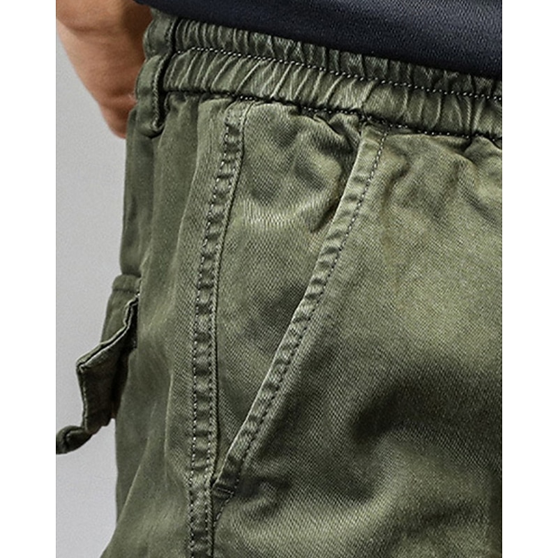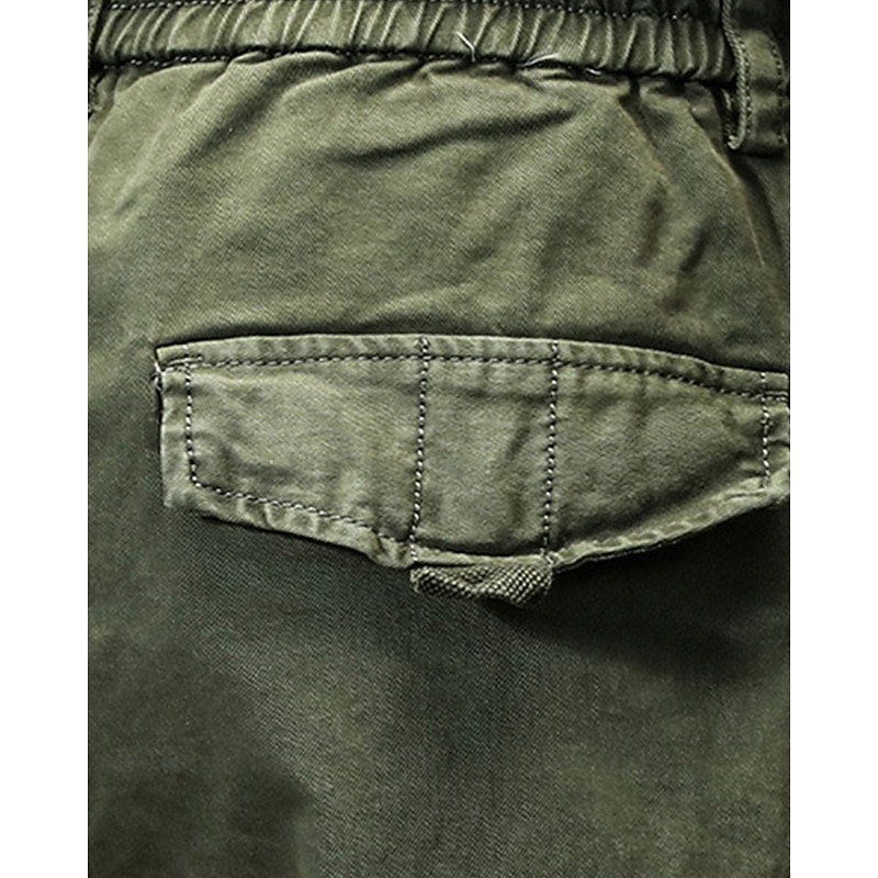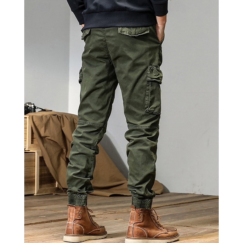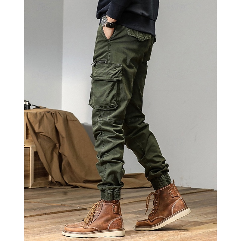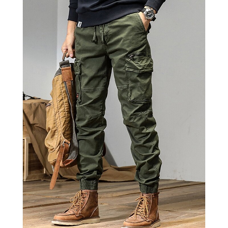 Highlights [Fabric]: Our men's cargo pants are crafted from a durable blend of 95% high-quality cotton, ensuring both comfort and resilience. The breathable material makes these pants ideal for active and leisurely pursuits. [Fit]: Designed for a regular fit, these cargo pants feature a relaxed silhouette with tapered elastic cuffs that offer a modern and stylish look. The mid-waist design provides a comfortable and secure fit, enhanced by an elastic waistband and drawstring for customizable comfort. [Design Highlights]: Equipped with multiple utility pockets, these cargo pants combine functionality with style. The earthy olive tone adds a versatile touch to your wardrobe, effortlessly pairing with various outfits for different occasions. The pants' design incorporates elastic waistbands and a drawstring, providing ease of movement and a secure fit. [Occasions]: Perfect for a variety of settings, these pants are an excellent choice for daily wear, as well as outdoor activities such as camping and hiking. Whether navigating urban landscapes or exploring rugged trails, these cargo pants cater to your adventurous lifestyle. [Sizing]: Available in a range of sizes from 29 to 38, these cargo pants offer options to accommodate different body types. They are designed to fit seamlessly into your wardrobe, providing a reliable choice for both casual and outdoor settings.