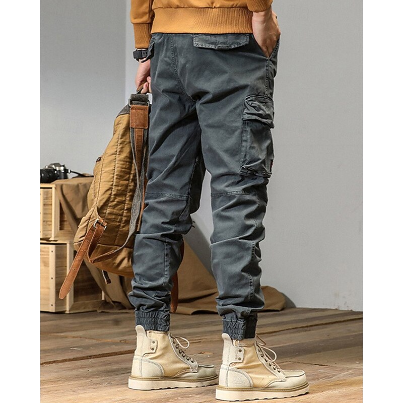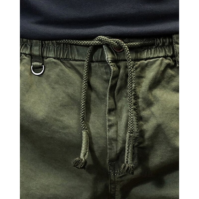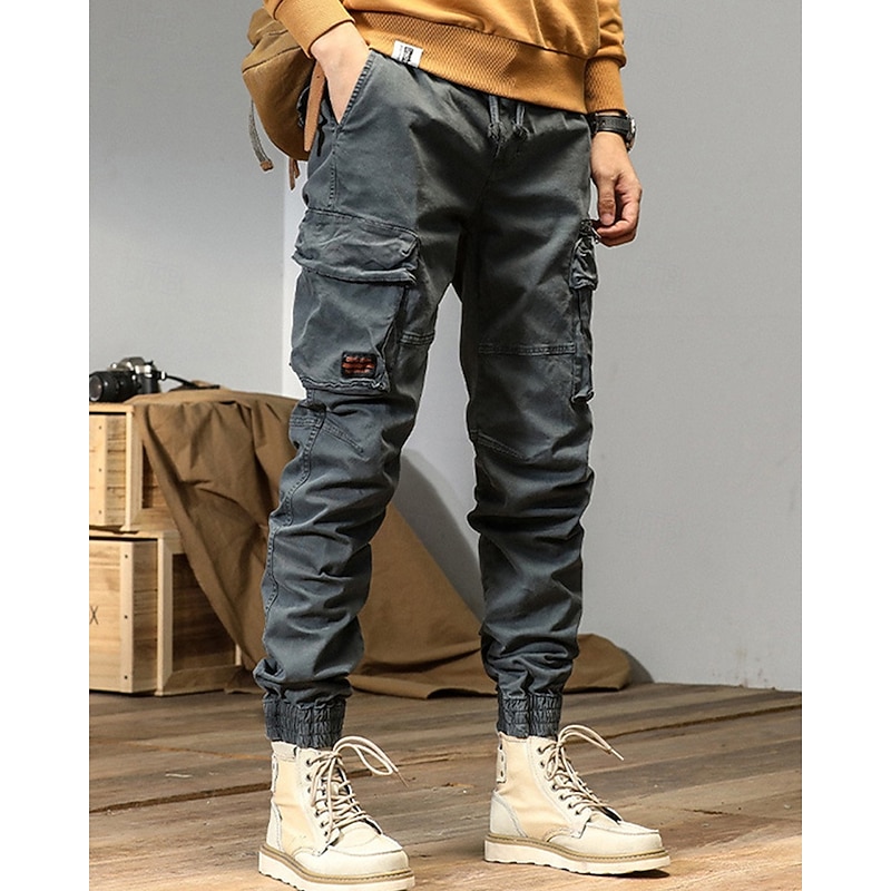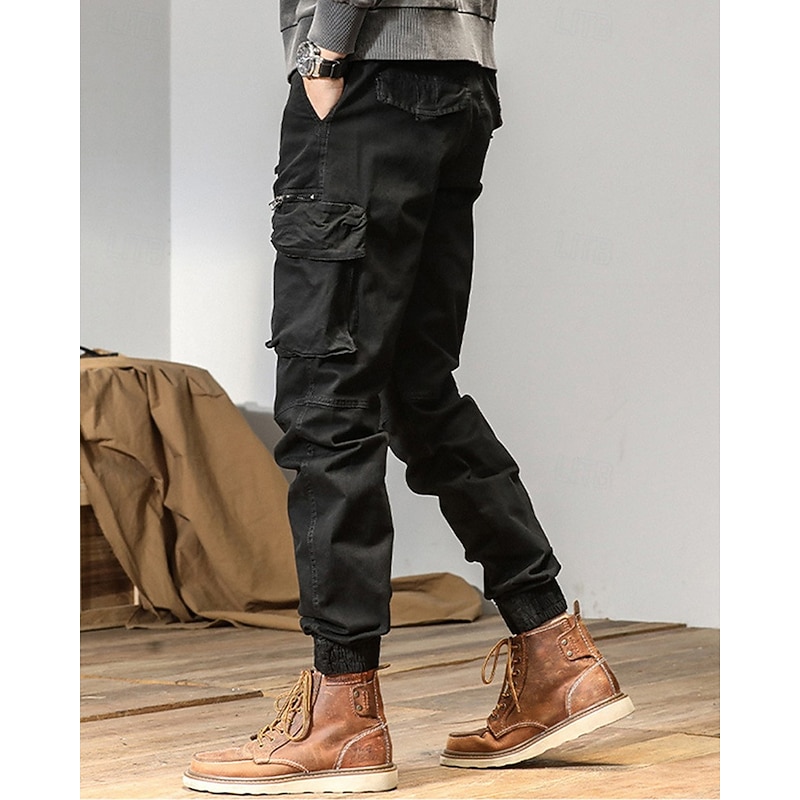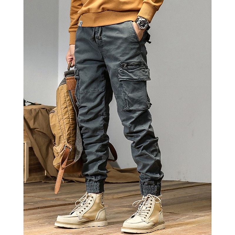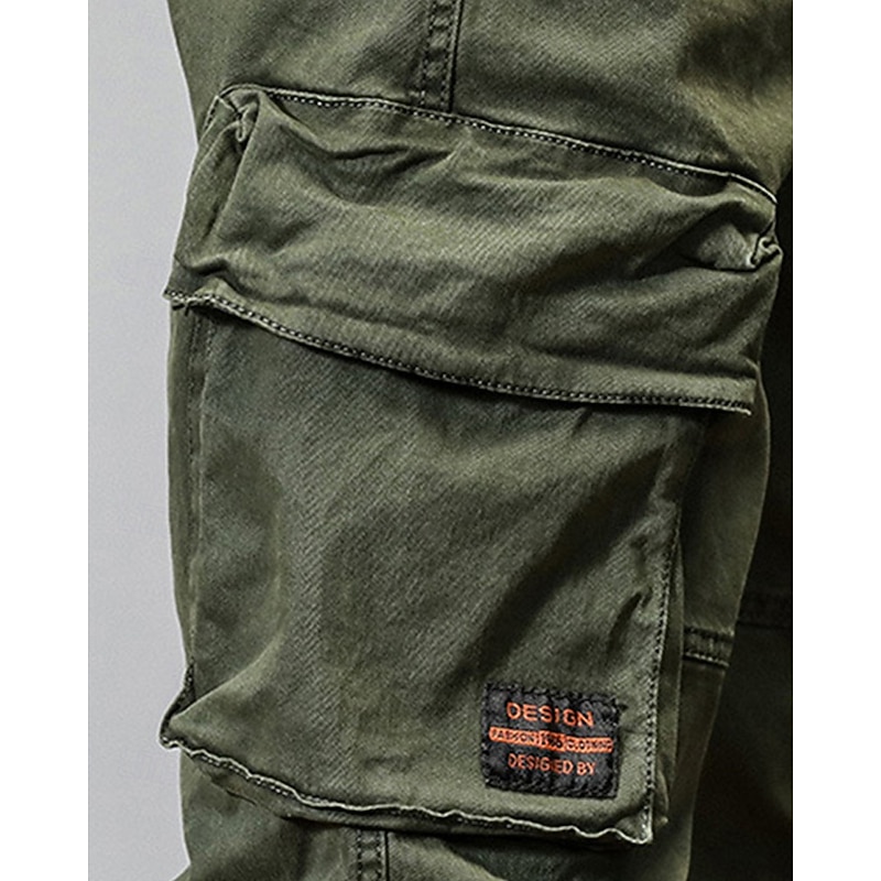 Highlights [Fabric]: Our men's cargo pants are crafted from a durable blend of 95% high-quality cotton, ensuring both comfort and resilience. The breathable material makes these pants ideal for active and leisurely pursuits. [Fit]: Designed for a regular fit, these cargo pants feature a relaxed silhouette with tapered elastic cuffs that offer a modern and stylish look. The mid-waist design provides a comfortable and secure fit, enhanced by an elastic waistband and drawstring for customizable comfort. [Design Highlights]: Equipped with multiple utility pockets, these cargo pants combine functionality with style. The earthy olive tone adds a versatile touch to your wardrobe, effortlessly pairing with various outfits for different occasions. The pants' design incorporates elastic waistbands and a drawstring, providing ease of movement and a secure fit. [Occasions]: Perfect for a variety of settings, these pants are an excellent choice for daily wear, as well as outdoor activities such as camping and hiking. Whether navigating urban landscapes or exploring rugged trails, these cargo pants cater to your adventurous lifestyle. [Sizing]: Available in a range of sizes from 29 to 38, these cargo pants offer options to accommodate different body types. They are designed to fit seamlessly into your wardrobe, providing a reliable choice for both casual and outdoor settings.