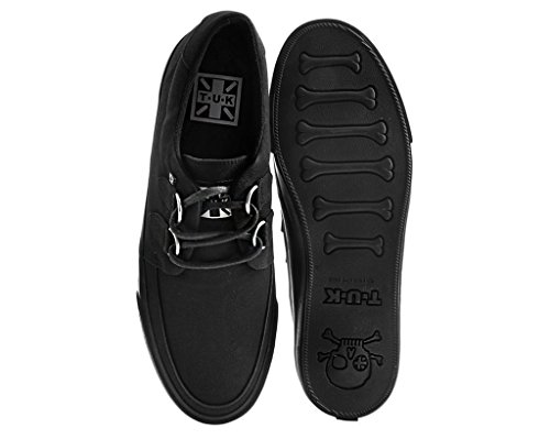 Sole material: RubberOuter material: RubberClosure type: Lace-UpEdgy Modern Design: T.U.K. vulcanized Twill Creeper Sneakers for Women and Men features our popular Creeper Shoe upper with classic D-rings.Premium Quality Vegan Material : T.U.K. Creeper Sneakers features a vegan friendly black twill upper Their sturdy construction ensures they can withstand regular wear and tear, providing all day wearability.Comfortable Fit: These vulcanized sneakers have removable insoles with memory foam and a lightly padded tongue for added comfort -- making it easy to wear these shoes for extended periods without discomfort.Versatile Style: The unique design of these shoes means they can be worn with a variety of outfits. They add a touch of edginess to casual outfits, and they can also be paired with more formal attire to create a bold fashion statement. These shoes can be dressed up or down, making them a great addition to any wardrobe. Whether paired with jeans, dresses, or skirts, they add a touch of edge and style to any outfit.The Original Creeper Company: T.U.K. Shoes creates original footwear for men and women with styles that were born in England but raised in California. Made for bands, music fanatics, individuals with eclectic tastes, punks and pin ups. T.U.K. Shoes makes a huge range from traditional classics to modern upstarts, constantly providing creative style with a gritty edge. Perfect for everyday use. High quality materials and excellent craftsmanship ensure long-lasting durability.