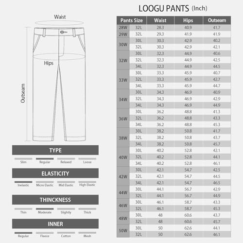 Fabric type: 100% PolyesterCare instructions: Machine WashOrigin: ImportedInseam: 32 Inches【Cargo Pants For Men】:This LOOGU men's pants utilizes 100% polyester, which is not only stay snug, but deters burrs from sticking during your outdoor working. Breathable, water-resistant, quick-drying, making it ideal for long hours spent in the outdoors. These cargo pants offer UV protection, keeping you shielded from harmful sun rays【Multi-pocket Pants】:With 7 pockets, including 2 slash pocket, 1 phone pocket, 2 velcro cargo pocket, 2 rear pocket,this mens pants offer ample storage for your essentials, such as phone, wallet and small accessories【Comfortable Cargo Pants】:The elastic waistband allow you to adjust the camo pants, providing a customizable fit. Crotch with triangular design for enhanced mobility and flexibility, allowing you to navigate rugged terrains with ease【Versatile Use】:The men's pants are suitable for spring, summer and autumn, impeccable for outdoor activities like cargo, hiking, working, camping, training, cycling, fishing, climbing, travelling, walking, jogging or casual wear【Size Choose】:These pants are available in S-5XL, please refer to the size chart we provided to make your choice, if you have any questions about the size or anything else you don't understand, please contact us and we will help you immediately