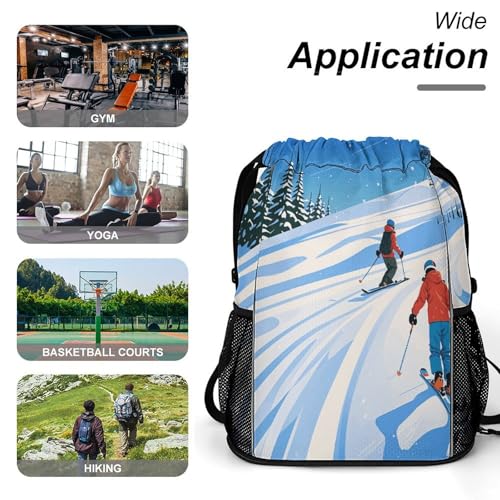 • Large Capacity: This Winter Sports Ski Theme Draw String Back Bag Measures 18" X 14.2" And Is Big Enough to Hold a Gym Clothes, Swimwear, Towel, Badminton, Basketball/Soccer Gear, Beach Essentials, Daily Supplies, Or Workout Items. Winter Sports Ski Theme Sports Backpack Is Perfect for the Gym, Sports, Trips, Travel, Camping, Hiking, Walking, Running, And More