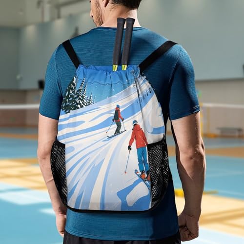 • Convenient Multi-compartments: This Winter Sports Ski Theme String Backpack Has a Dedicated Shoe Compartment at the Base That Lets You Store Extra Footwear Separately. The Drawstring Main Compartment Holds Clothes, Towel, Badminton; Wet-Proof Pocket Perfect for Wet Swimsuits, Toiletries; Two Side Mesh Pockets Offer Easy Access to Water Bottles and Umbrellas