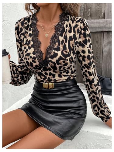 SOLY HUX Women's Tops Leopard Print Lace Trim T Shirt V Neck Bishop Long Sleeve Tee
